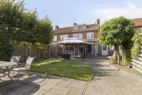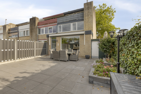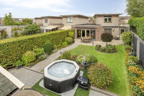 De achtertuin is strak en onderhoudsvriendelijk aangelegd, met sierbestrating en groene erfafscheiding. Dankzij de ligging op het zuiden kun je hier vrijwel de hele dag van de zon genieten. Een heerlijke plek voor kinderen om te spelen, maar ook om ’s avonds nog lekker buiten te eten of lekker in te relaxen. Achterin de tuin staat een houten berging voorzien van elektra, perfect voor je fietsen, gereedschap of extra vriezer of koelkast. Via de achterom bereik je gemakkelijk de brandgang en kom je met de fiets de tuin in.