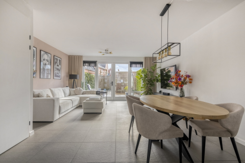 De uitgebouwde woonkamer en open keuken vormen samen een royale leefruimte van maar liefst 48 m². Hier heb je alle ruimte voor een grote eettafel met zes stoelen én een royale zithoek voor gezellige filmavonden of spelletjes met de kinderen. Dankzij de dubbele openslaande tuindeuren en een aparte loopdeur stroomt het daglicht binnen, en is de tuin op zonnige dagen een verlengstuk van je woonkamer.